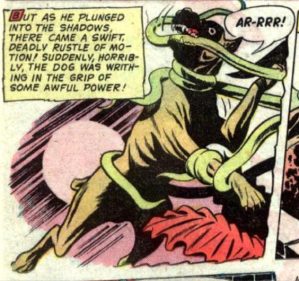 Having “heard his dog cry out, as if in agony” he ran to towards the sound and found the poor creature “enveloped in a perfect network of what seemed to be a fine rope- like tissue of roots and fibres….covered with a thick viscid gum that had was “nauseating to inhale..”