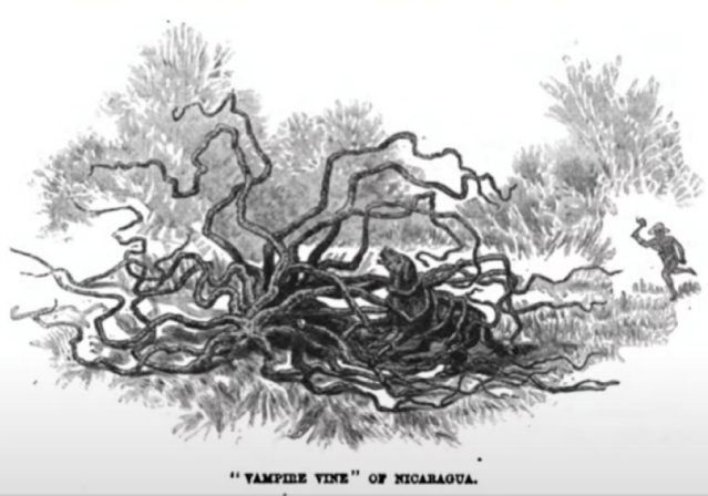 Another one of these octopus-like nasties was reported from Nicaragua. However, instead of using spikes to impale or strong leaves to crush it sucks the life blood from its victims. Accounts begin to appear in late 1889 in US newspapers but soon spread more widely. Here’s the version from The Spectator of October 24th 1891. Headed A Cannibal Plant it tells of a naturalist, a Mr Dunstan who had spent two years botanising and collecting insects in central America who discovered “a singular growth in one of the swamps which surround the great lakes of Nicaragua.”