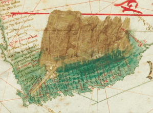 Almost a generation later, the Miller Atlas of 1519, given as a gift by the King of Portugal to his French counterpart has more images of later Portuguese discoveries during their explorations of Brazil and the Indian Ocean. Those of Brazil must have been based on first hand sketches and observations but they do not appear to be representations of particular places, merely evocations of the country as a whole. These maps were also kept highly secret because of their geo-political value. We have to wait about 50 years to begin getting a flow of images drawn from life.