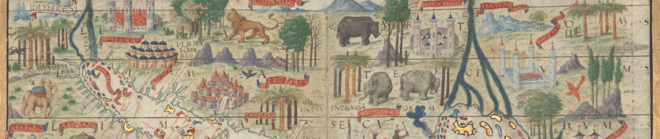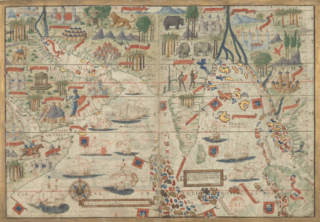 By comparison the representations of the lands around the Indian Ocean is sketchy to say the least, and shows how the Portuguese were mainly concerned about recording the coastline, merely ornamenting the rest of the map with largely imaginary items, with just elephants and a rhinoceros drawn from life. The King of Portugal managed to bring a rhinoceros to Europe in 1515, which he famously sent as a gift to the Pope.