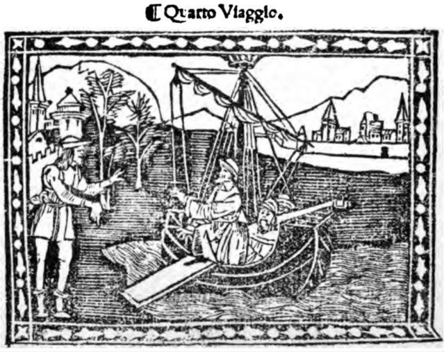 According to the woodcut on the left Hispaniola apparently had a fortified town and a thriving building industry although of course it didn’t, while the boat in the last image [below] is slightly more realistic even if the map of the crowded Caribbean islands with their towns isn’t.