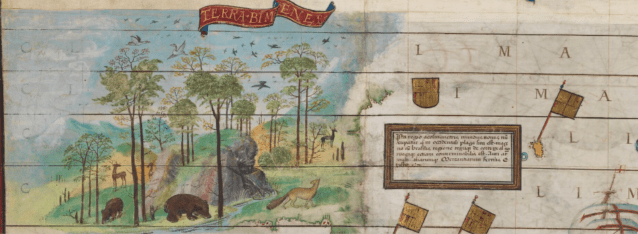 This does not mean that there are no European representations of other aspects of the Americas. Notably we have marginalia and decorative panels on maps – which include representations of the land and some of the flora and fauna such as this map drawn up for the Portuguese crown to mark the Treaty of Tordesillas of 1494 and copied illicitly and smuggled to the ruler of the Italian city-state of Modena in 1502.