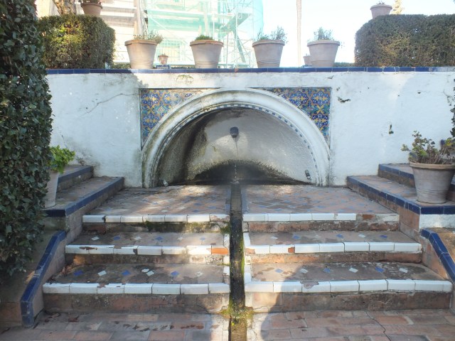 The site, “crowded between the street and the ravine” sloped quite sharply away from the house so the garden is arranged on three terraces, linked by short flights of red brick steps and united by a flow of water throughout its length. A large cistern was placed on top of the house which fed water to a wall fountain lined with colourful Andalucian tiles [azuljenos] on the top terrace, which is also largely decorated with neo-Mudejar tiling. The water then went through a long rill lined with bricks and more coloured tiles down to another basin [seen in the postcard below] on the lower level.