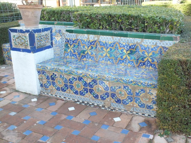Originally planted as a rose arbour it is now covered by a venerable wisteria. There are also several Hispano-Moorish tiled benches throughout the garden.