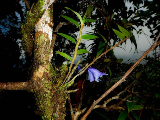 I was however wrong in thinking that what usually passes for blue orchids are simply white ones that have been dyed. Andre Schuiteman, one of Kew’s top orchid experts says there are actually a few Australian terrestrial orchids that are blue, and even a very few epiphytic ones. One of these was an otherwise “unremarkable” dried Dendrobium specimen from New Guinea, in the herbarium of London’s Natural History Museum.