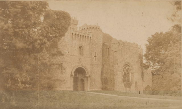 Proctor’s idea, realised by Smith, was to link the house to the mediaeval ruins with a grand neo-Norman entrance gateway, an additional room on the side of the house to hide the join in style and materials, and a summerhouse which together became known as The Folly. All this work was faced a mix of flint rubble and cement modelled in imitation of rough-hewn blocks of stone.