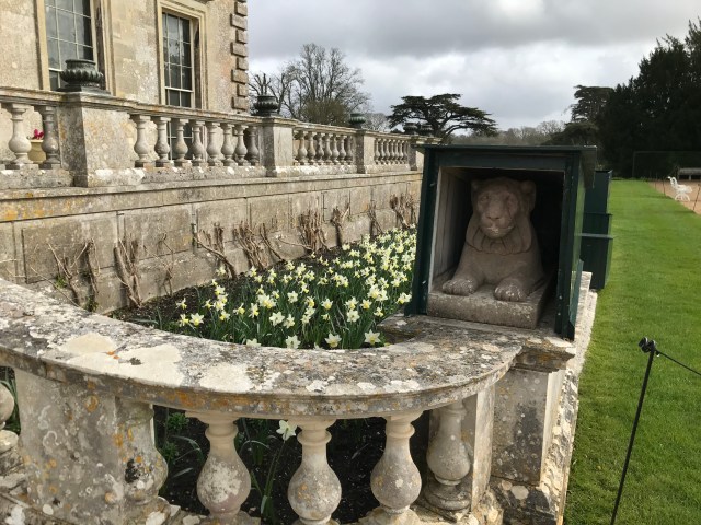 One of the stone lions at Kingston Lacy peeking out from his winter protection [my photo]