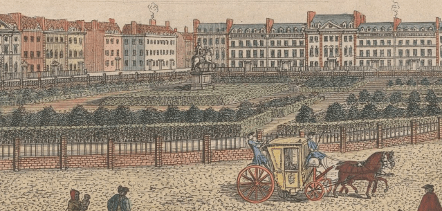 Nost cast the figure of the horse from moulds made from Le Sueur’s statue of King Charles I at Charing Cross, and he went on to use the same cast to produce several more lead versions for other patrons. That for the Duke of Chandos was gilded and stood on a pedestal carved with the trophies of war in the gardens at Canons. After the sale and demolition of Canons in 1747 the statue was bought by the residents of Leicester Square, and installed at the centre of the Square. For the rest of its tragi-comic story see this earlier post.