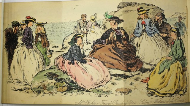 By this point algology or the study of seaweeds had reached the same sort of popularity as Fern Fever or orchid mania. However, despite the fact the seashore was a place where social norms were less restrictive, and there was some licence to wear more practical dress the differences between the roles of women and men were still as noticeable. Margaret says, for example “If anything would excuse a woman for imitating the costume of a man, it would be what she suffers as a sea-weed collector from those necessary draperies. But to make the best of a bad matter, let woollen be in the ascendant as much as possible; and let the petticoats never come below the ankle.” However it’s also clear that the collecting part f algology could be viewed as a family activity. One of her diary entries for 1850 reads: ‘Set off for Filey, Alfred, self, seven children, two nurses and the cook. Arrived safely.,, went down to the sand and found seaweeds.’