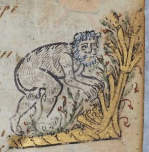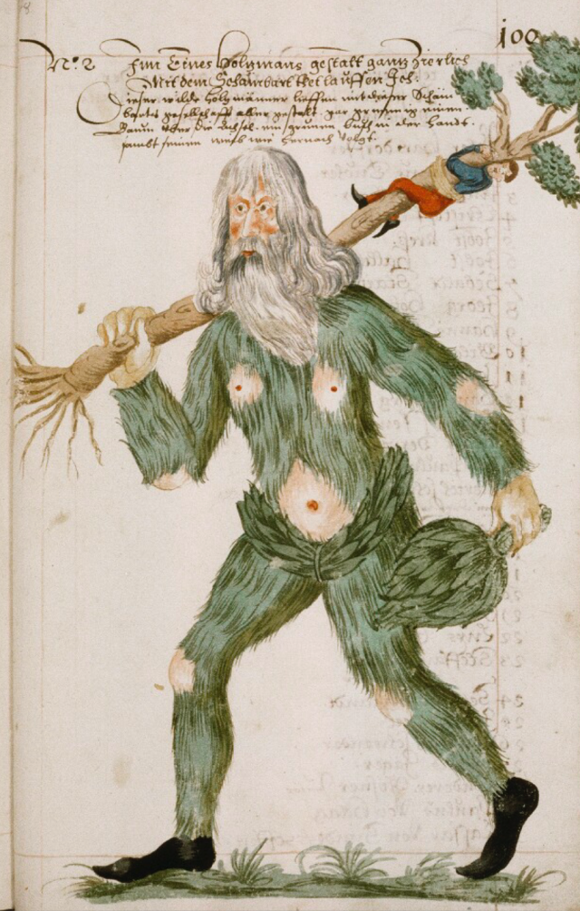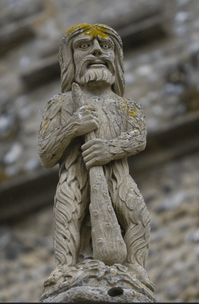 Wild men are big, hairy, primitive, woodland creatures, although they don’t have any animal characteristics, so no hooves, horns or tails. They were usually shown wielding a branch, or even a whole tree, as a club, and sometimes crowned and belted with leaves.