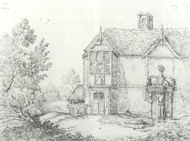 There is also a drawing of it in the British Museum, although it’s not in the on-line collection, as well as a lengthy commentary about it written before the house was demolished around 1820. “Immediately upon your peeping through the wicket, the first object that unavoidably struck you, was a stone figure of Hercules*[this was footnoted with the next paragraph], as it was called, holding in one hand a club across his shoulders, the other resting on one hip, discharging a perennial stream of water, by the urinary passage, into a carved stone basin. On the pedestal of the statue is preserved the date, 1578, which was the year the queen graced this house with her presence; so that doubtless this was one of the embellishments bestowed upon the place against a royal visit. Modern times would scarcely devise such a piece of sculpture as an amusing spectacle for a virgin princess. A fountain was generally (yet surely injudiciously in this climate) esteemed a proper ornament for the inner court of a great house. This, which still continues to flow, was supplied with water by wooden pipes, at no small expense, from a pond near half a mile off.The footnote read: “Perhaps he might be designed to represent a wild man, or savage, having no attribute of Hercules but his club, and all his limbs being covered with thick hair, and his loins surrounded with a girdle of foliage. He resembles much the supporters of the arms of the late lord Berkley of Stratton, and of the present Sir John Wodehouse. Hombre Salvagio, just come out of the woods, with an oaken plant in his hand, and forgrown with moss and ivy, was one of the personages that addressed queen Elizabeth at her famous entertainment at Kenelworth Castle.”