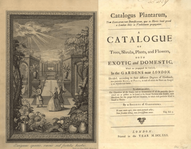 The Catalogus stressed that “In all we promise the publick to be as careful as possible not to lead them into mistakes, nor will we mention any particular tree, plant, flower or fruit which is not in our own garden … we do not propose to mention many different species of trees and plants that are either in the Public Botanick Garden, nor that may be in the possession of some curious gentlemen, but only such as are actually in the nurseries of persons belonging to this Society and from where any Gentleman may be furnished with any of the particulars here treated of by directing their letters for the Society of Gardeners at Newhall’s Coffee House in Chelsea, Nr. London, at the easiest rates.”