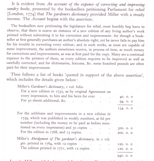 Miller must have been conscious that the dictionary was expensive so he also produced an Abridgement in eight editions (1735–71) and a practical, even cheaper, Gardeners Kalendar in fifteen editions (1731–69). These various publications provided him with a sizeable regular income – which can be deduced from evidence presented in a petition to Parliament about copyright in 1774.