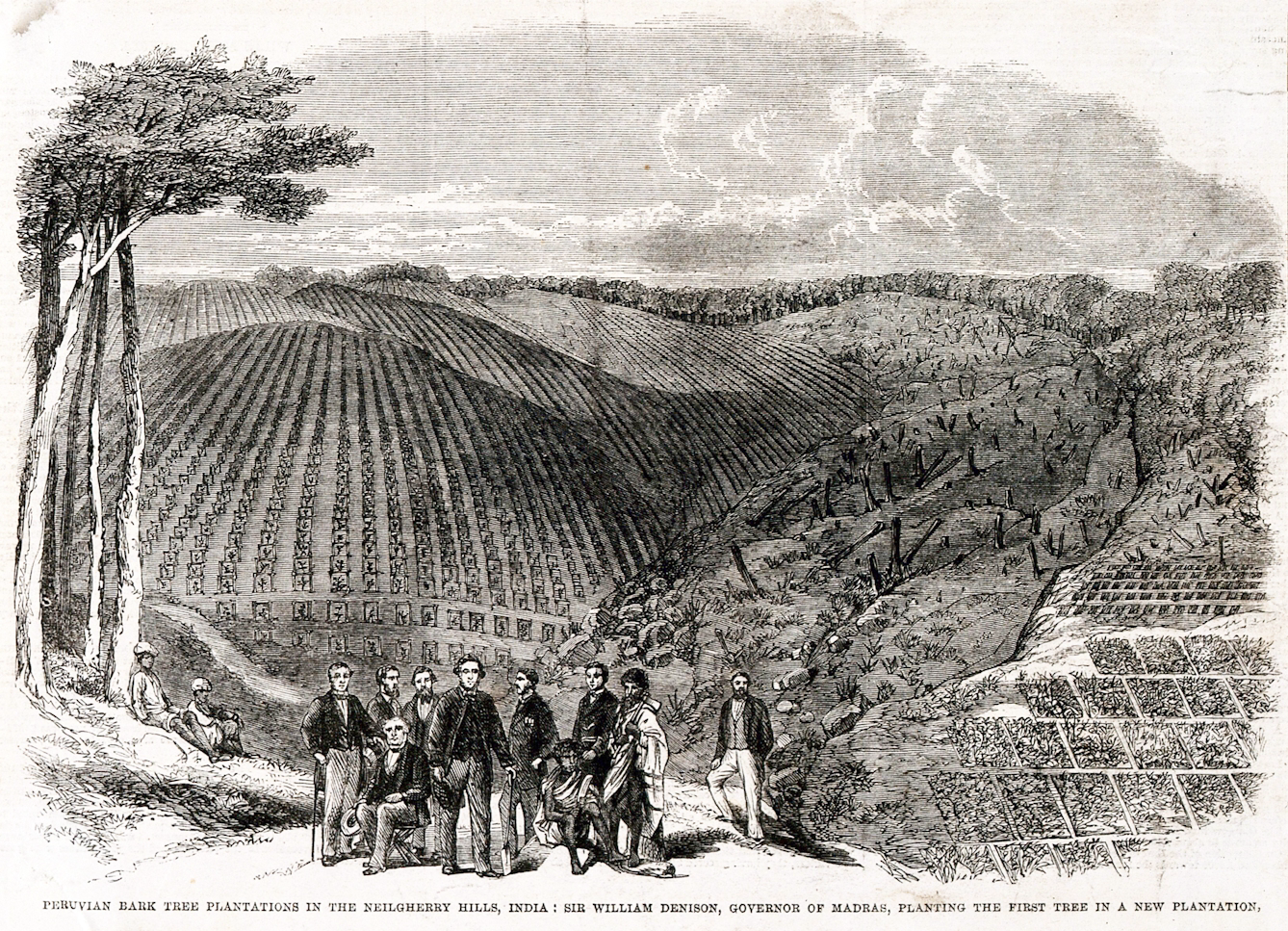 When the cinchona trees were of a suitable size for transplanting into open ground McIvor chose land on the slopes of the highest local peak – Doddabetta – some 6800 ft up and 17 miles from Ooty. The new venture was considered so important that the first trees were planted by the Governor of Madras, Sir William Denison, on the 30th August 1862 and even reported in the Illustrated London News. McIvor himself moved out to Doddabetta so that he was on site to deal with any problems and to oversee trials of different growing conditions and techniques.