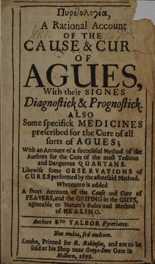 Nowadays we know malaria is caused by a parasite carried by female mosquitos, but in the past it was thought to be caused by pestilential fumes arising from swamps – literally from “bad air”. In Britain the disease was know as ague and was a major cause of death especially for young children. [For more on this see Paul Reiter’s article From Shakespeare to Defoe: Malaria in England in the Little Ice Age]