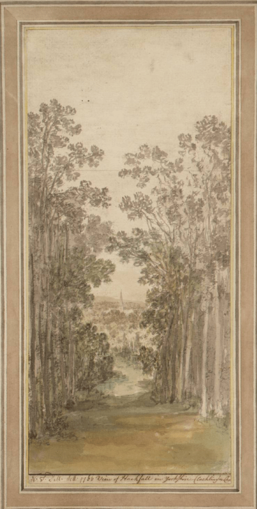 The next morning “The chaise tourists now took their departure in two chaises: hence they go to view (the late) Mr Weddel’s seat at Newby; and they civilly offer’d me a seat in their chaises; but I do not envy chaise tourists, who are to be hurried, and jolted along, in danger of bad roads, and without ever seeing a County to advantage; and why go away in such a rainy morning, when everything must appear to disadvantage?” Instead he wandered round Ripon seeing the Minster and other sights until the weather cheered up then at 3.00 set off for Hackfall.