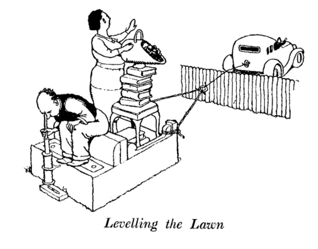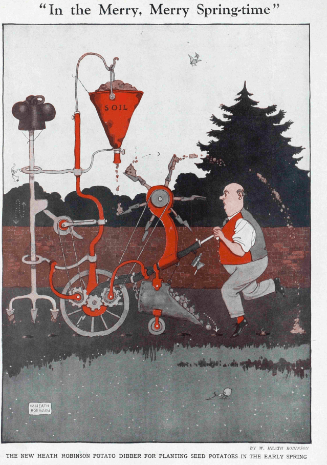 For more information the best place to start is with the website of the Heath Robinson Museum in Pinner where he lived for a time. If you have time there’s also a free on-line lecture about him by Luci Gosling on YouTube. Several of his books, or books about him can be found on Archive.org, including a good compilation called Contraptions edited by his biographer Geoffrey Beard. Unfortunately How to Make A Garden Grow is not one of them although it is easily available either second-hand or as an e-book. from Vintage Words of Wisdom Books.