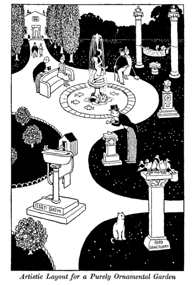 We now turn in chapter 7 to the subject of garden ornaments, such as statuary, birdbaths, or sundials and even the almost unspeakable “horrid rash to rush of little model gnomes, dwarfs, elves and similar whimsicalities.”