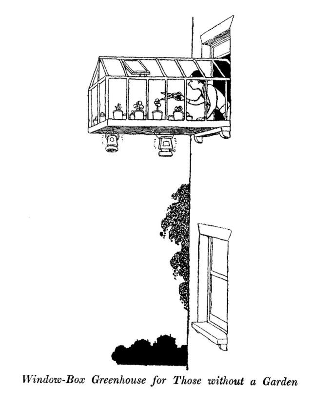 Heath Robinson suggested adding a changing room when the gardener could “exchange their winter woolies for the latest in water-wear” in order to take advantage of the heat inside.