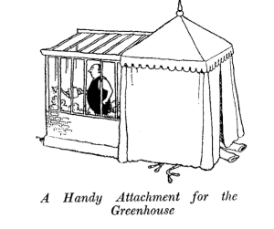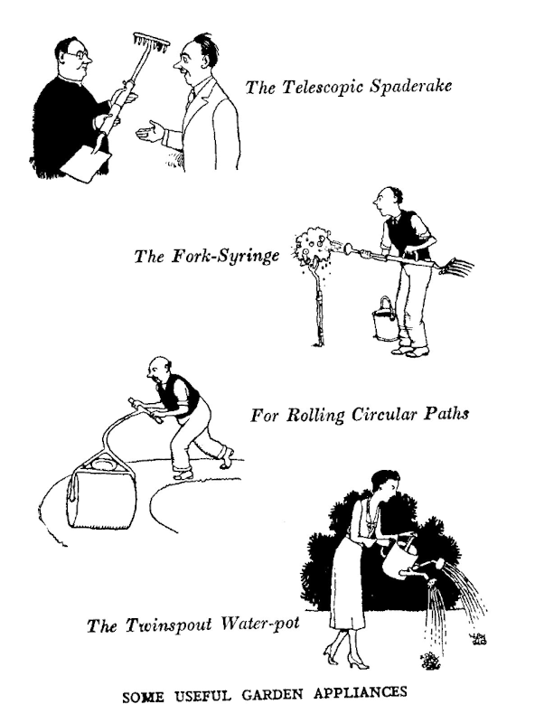 “Nowadays gardening is a highly complicated science, bristling with Latin phrases and giving employment to a large number of deserving workers” who include “the manufacturers of hose-pipery, the designers of garden-rollers, the intrepid experts who insert the essential teeth in rakes, the knitters of netting for nut-trees,…the skilled craftsmen who operate the interlocutory bivalvular Hoppskotsch machines which impart the essential rotundity to the ball-bearings of lawn-mowers” etc etc.