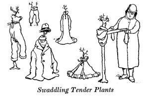 The season can be extended through the autumn with carefully well thought out ideas for helping the trees to stay greener for longer. And winter need not be depressing, indeed the garden “can be made almost as attractive in December as in June. All that is required is a few artificial flowers preferably made from tin to withstand hailstorms one or two imitation Rose trees in frost-proof, zinc, a little synthetic heat in the form of portable oil, stoves, plenty of umbrellas, a lot of imagination and a set of warm woollen underwear for everybody.”