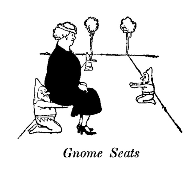 And again, Heath Robinson comes up with some dual-purpose garden ornaments including several for gnomes since after all “fifty million gardeners cannot possibly be wrong” about them.