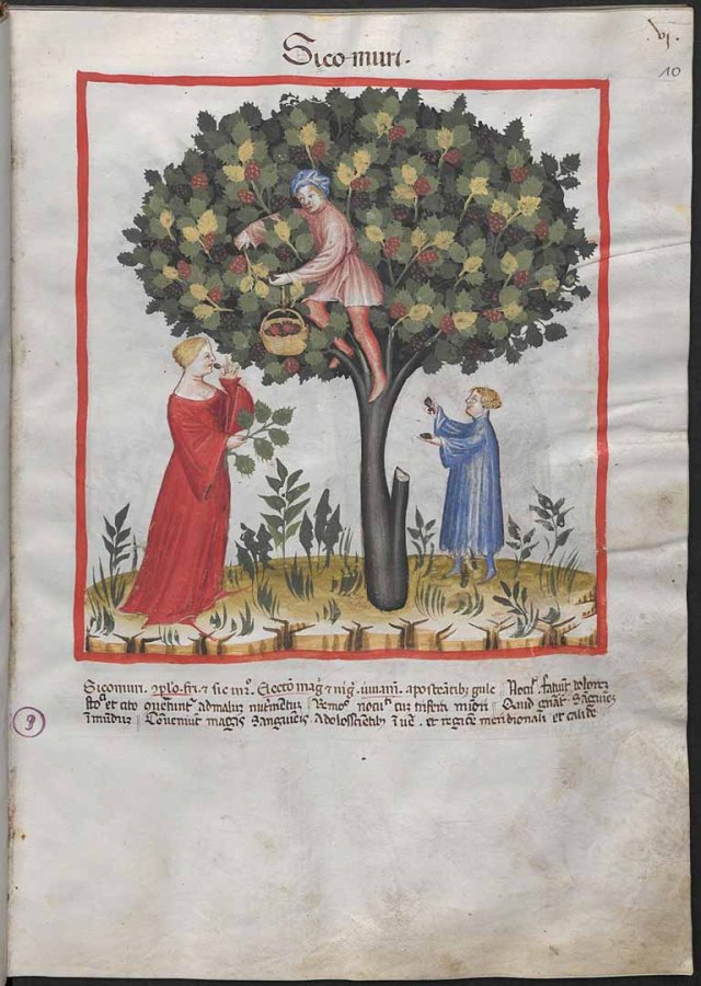 The Romans introduced Black Mulberries right across their empire, and traces of them have been found at several sites in Britain. Since trees are long lived and easy to propagate it’s no surprise they are often recorded in monastery gardens. They were certainly common enough in the mediaeval period to give their name to a colour – either ‘mulberry’ or ‘murrey’.