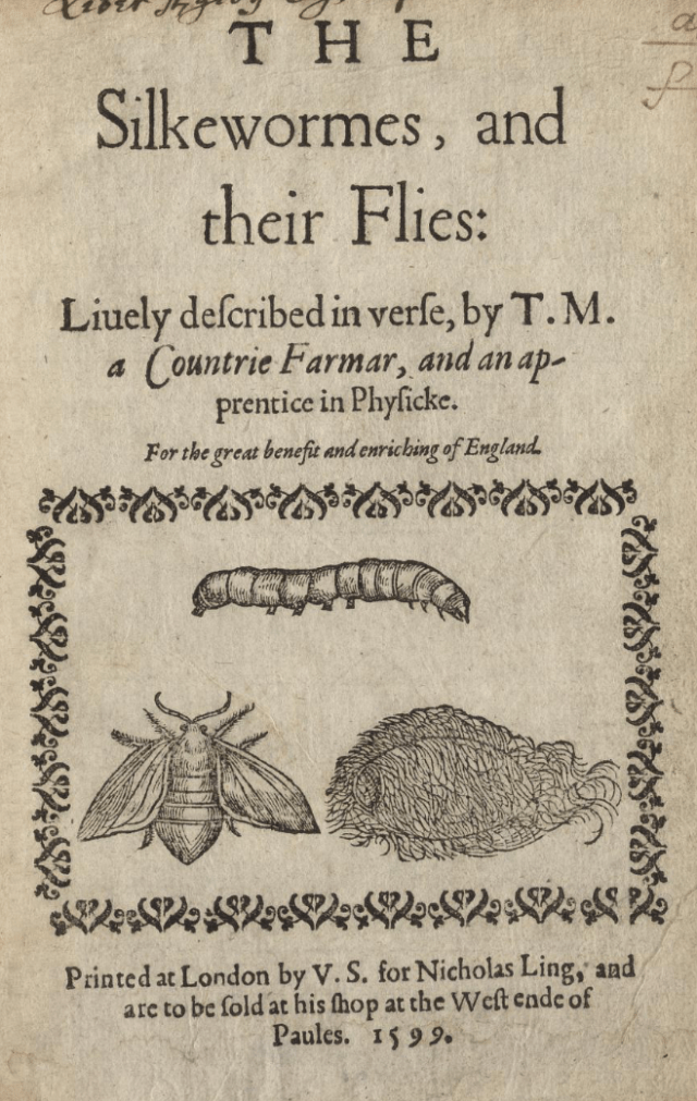 In 1607 de Serre’s book was translated by Nicholas Geffe as The Perfect Use of Silk-wormes and their Benefit, in which he argued “we may as well be silk masters as sheep masters,” and suggested planting mulberry trees everywhere, in preparation for feeding silkworms. The book was dedicated to James who saw establishing sericulture as a hugely ambitious project, with national honour at stake.