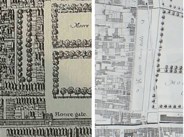 Little Moorfields from the Leake & Hollar post-Fire map 1667 and the Ogilby & Morgan map of rebuilt London, 1676