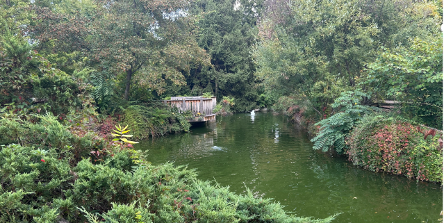 This hidden section is informal, shady and heavily planted with trees and shrubs around a pool and bridge, and can be reached independently of the rest of the gardens, as well as from doorways in the back of the arcade.
