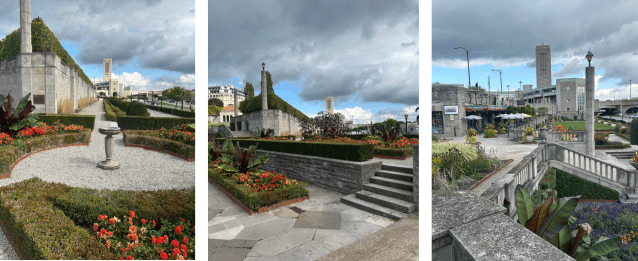 I mentioned these gardens in a post a few years back about the life of the pioneering female landscape architect Lorrie Dunington and her husband Howard Grubb. They designed the grounds and collaborated with the architect William Lyon Somerville to use the natural contours of the land to create a series of gardens around a central sloping fan-shaped grass amphitheatre. One of these incorporate part of the foundation wall of the old Clifton Hotel.