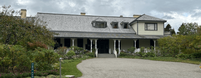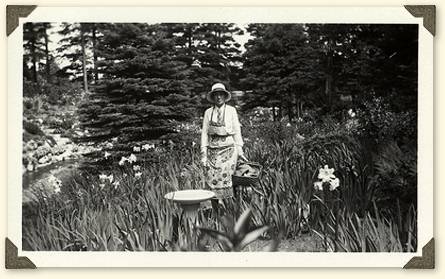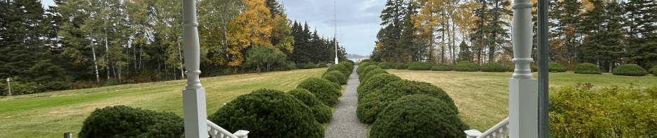 On the side of the house which looks out onto the St Lawrence there is an “avenue” of dwarf pines cut into mounds, that carried the eye through a gap in the trees to a view of the river. The flag pole you can see at the end of the garden was important to Elsie. According to her grandson Robert William Reford, not only was “Granny Reford” an “impressive lady with many talents, she was a strong believer in the Monarchy and the British Empire. At Metis, the Union Jack was always flown from the flagstaff. When a Cunard ship sailed past, on her way between Montreal and Southampton or Liverpool, the flag would be lowered in salute. The ship would respond with a blast from its foghorn.”