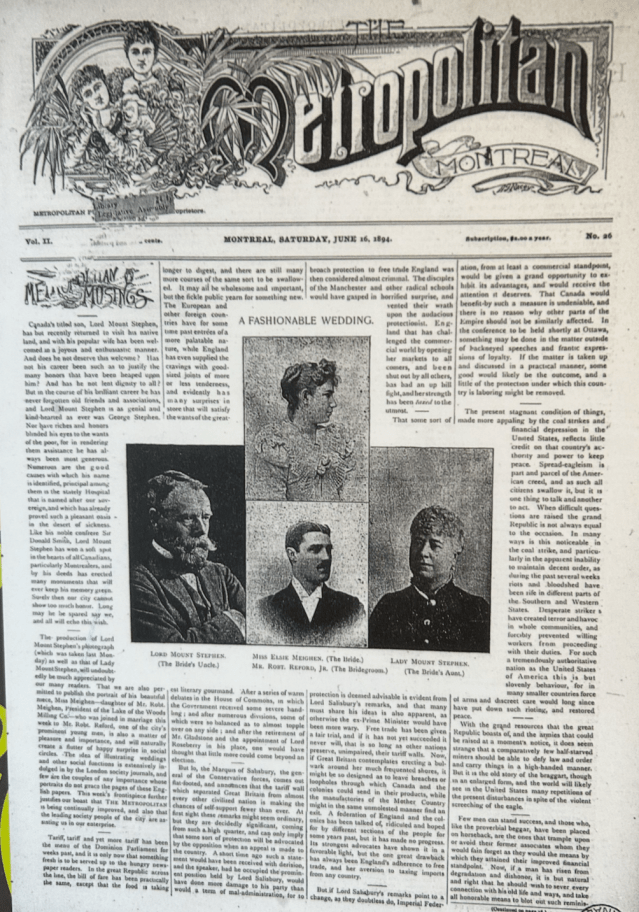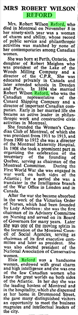 Her wedding to Robert Reford in 1894 made the front page of the Montreal press and after it she began a life of philanthropic, civic and political involvement which included, amongst many other things, c0-founding the Women’s Canadian Club because she felt that her contemporaries were living in a blissful ignorance about matters of public concern which was in the words of her great-grandson Alexander “both unfortunate and disgraceful”.