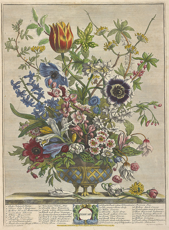 Crocus are included too in Robert Furber’s Twelve Months of Flowers (1730) and the follow-up The Flower Garden Display’d .(1734) Both include not only several crocus in the plate for February but also a yellow colchicum in the September group, and Saffron in October. Additionally The Flower Garden Display’d has a whole chapter on The Art of raising Flowers without Trouble; to blow in full Perfection in the Depth of Winter, in a Bedchamber, Closet, or Dining-Room.” It was supposedly written by someone named Sir Thomas More Bart. [according to Catherine Horwood in her Potted History p.49] this is likely to have been a botanist named More since there was no knight of that name at the time] and again it includes suggestions for crocus and snowdrops being used as house plants for winter display.
