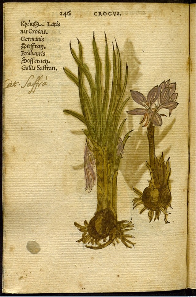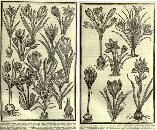 By the time John Gerard published his Herbal in 1597 he includes seven “sundry sorts” including both spring and autumn flowering crocus, Wild Saffron, and Meadow Saffron, some of which he had obtained through the good offices of Carolus Clusius of the Leiden Botanic Garden.