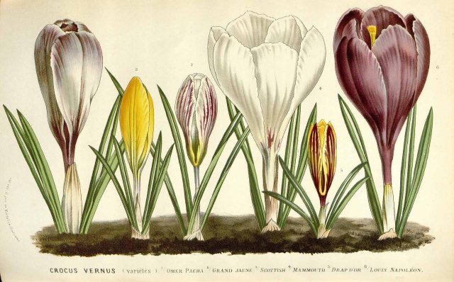 The notice also included lengthy comments by a Mr Barrell of Spalding who explained that “The yellow Dutch Crocus is the variety most esteemed for profit; although large quantities of the white and blue varieties (of C. vernus), such as David Rizzio, Prince Albert, Queen Victoria, and Walter Scott, are grown.” [These were all still being listed in the 1920s but seem to been superseded & I can’t find any colour images of any of them]
