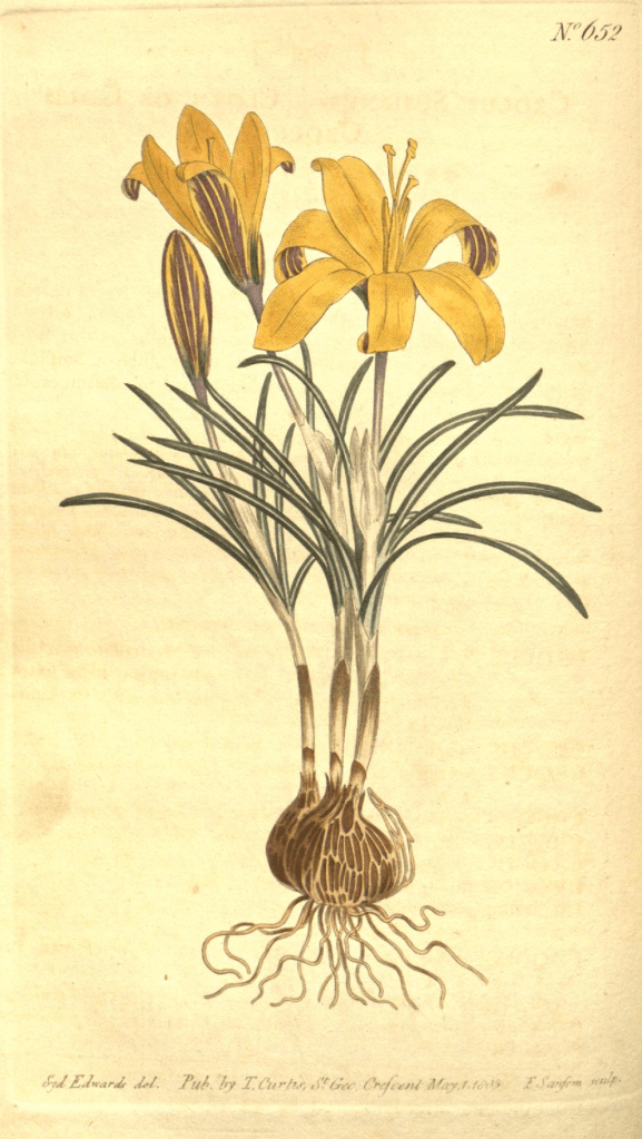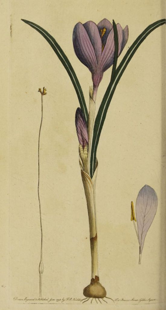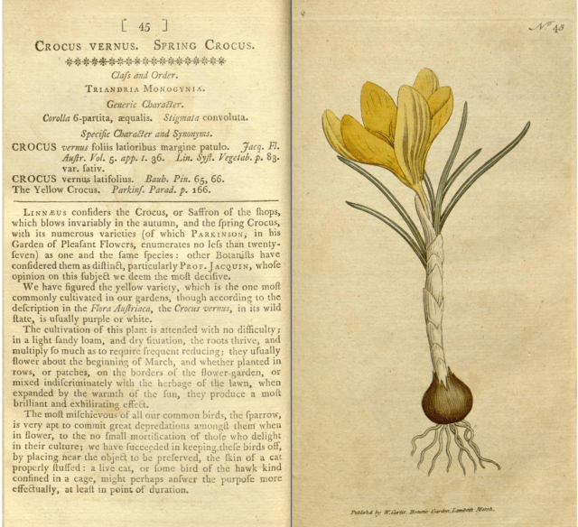 After that the scientific study of the genus was slow. The common yellow Crocus vernus appeared in the first volume of William Curtis’s Botanical Magazine in 1787 . There is however little botanical information to accompany the illustration but the reader is advised how to best protect crocus from attacks by sparrows by placing “near the object to be preserved, the skin of a cat properly stuffed”.