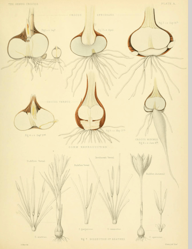 While there was more complex taxonomic discussion over the next few decades it’s not until 1886 that the first major study was published by George Maw. Maw was another supposed amateur. In his other life he was the owner of a successful tile making business. However he was an extremely diligent botanist and gardener writing a heavyweight but beautifully illustrated A monograph of the genus Crocus in the best traditions of Victorian botany which underlies the modern understanding of the genus, that took him eight years to write.