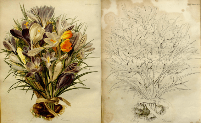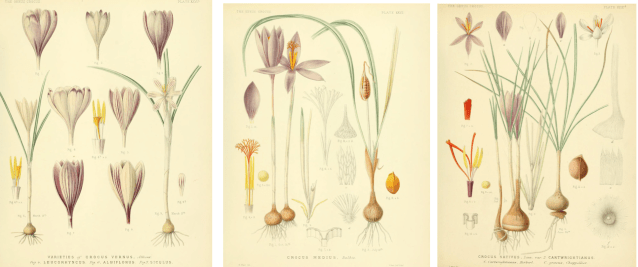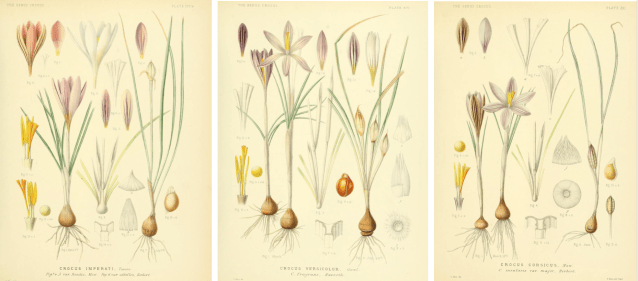 The next to investigate crocus was William Herbert, Dean of Manchester, who did it even more thoroughly, based on his own experiments with the hybridisation, although unfortunately he did not include any illustrations. An expert on bulbs [see this earlier post] in the 1847 Journal of the Horticultural Society he listed the 43 species he identified, clearly explaining where the seed or corm had come from, and in the process showing the extensive networks that existed between botanists not just in Britain but across Europe, and which often called on diplomats to help gather and return them to Britain.