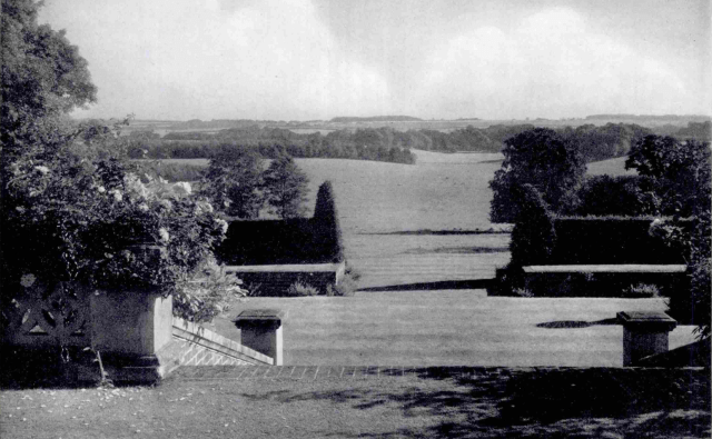 One of the great assets of Hinton is its location on the top of a ridge which commands a prospect across a broad green valley, farms and woodlands to the slopes of the Downs beyond. The top of the ridge, where the house, kitchen garden and nearby Church stand, is comparatively level, but to the east to the south the land slopes considerably, making possible a series of terraces and separate gardens.