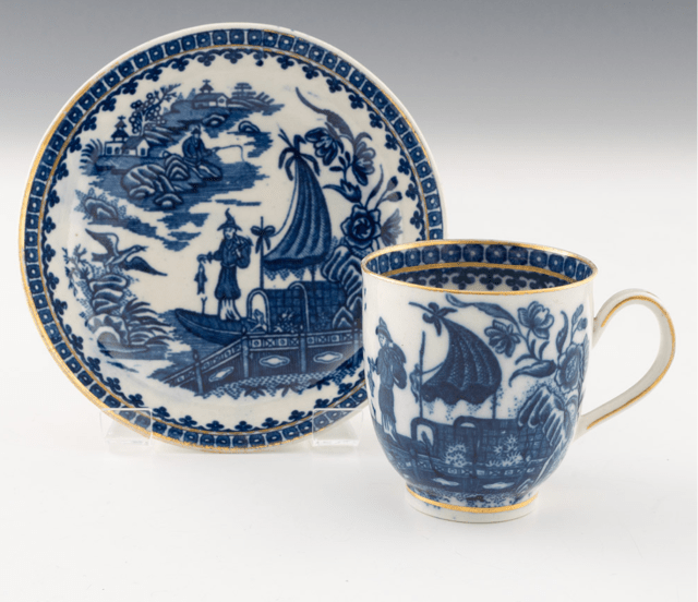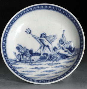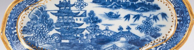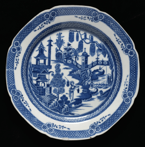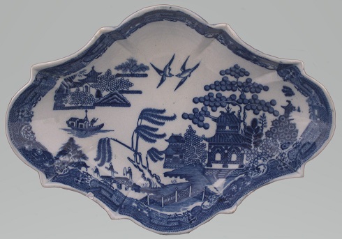 Nor, as you can see from these other pieces, is the Willow Pattern the only design that was tried, although there are many similarities. The “oriental” motifs were arranged in different forms and layouts, sometimes simple but often really quite complex assemblages to create a wide variety of scenes and settings. The ceramics factories often gave the resultant patterns Chinese names such as Mandarin or Nankin for example but it’s not until c.1780 that the specific design we now know as the Willow Pattern first appeared.