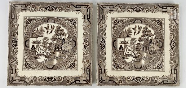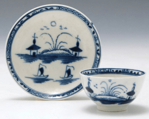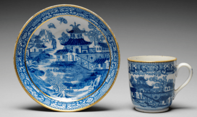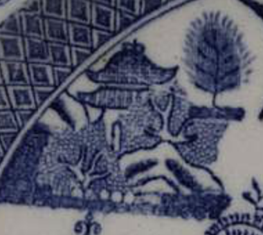 They used pagodas and pavilions with “flicked-up” roofs, elaborate fretwork bridges, stylised exotic birds, trees, and plants, figures dressed in “oriental” styles , and often with lakes or waterside locations. While all these were based on original Chinese designs the various elements were re-arranged and adapted at will.