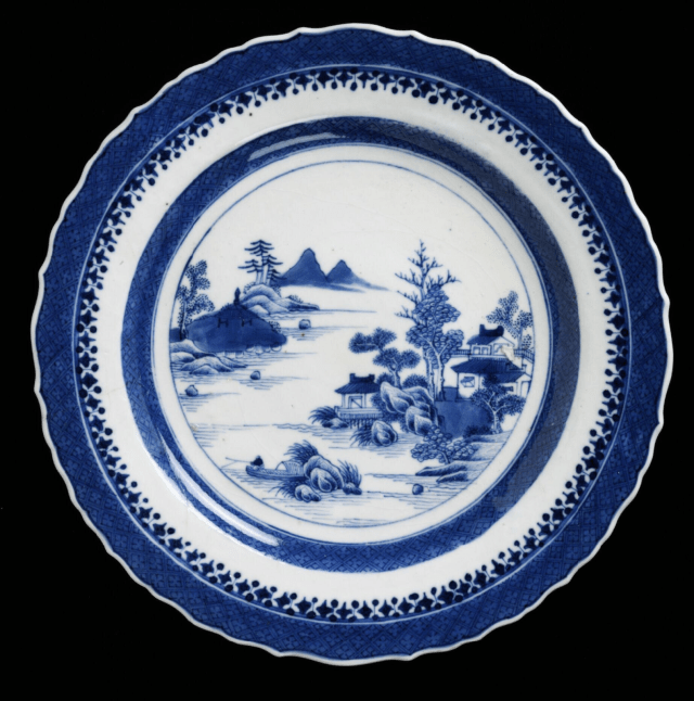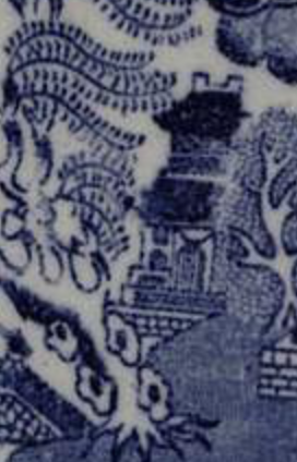 It wasn’t until 1710 that the Meissen factory in Saxony managed to make porcelain with local clays that Europe began to catch up with China. Other pottery factories, including many in Britain, followed, but, as explained in a very readable account – The Arcanum by Janet Gleeson – it took a long time before they could replicate the quality of Chinese wares. However what the ceramics industry in Britain did do from the mid-18thc onwards was to adopt a new technique of transfer printing patterns onto plain white wares rather than hand painting designs. This allowed highly complex patterns, to be put on quickly and cheaply. Although other colours – notably brown, black and pink – were tried for the decoration it was the same shade of cobalt blue used by the Chinese that was then, and remains now, the most popular.