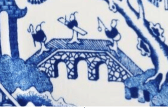 The Gods, seeing their plight, immortalised them as two doves which you can see flying together at the top of the Willow Pattern. So now we can all; breathe a sigh of relief at the story having a happy ending… and, of course knowing what we’re eating our dinner off!