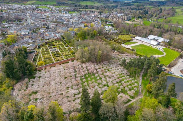 Over the next few years The Grange became a cherry blossom trading post. Scions arrived from all over Japan, usually kept alive by soggy moss packed around the base of each piece. Ingram grafted them onto native cherries and planted them for later propagation. However his attempts to return Tai-Haku were not so successful, and for the first five years all his consignments arrived dead at least in part because they were sent via a sea-route route through the tropics. However in 1932 he hit on a new plan, sending the scions pushed into small potatoes to provide moisture, via the Trans-Siberian railway. This worked and Tai-Haku returned to Japan. It is now widespread including what is thought to be the world’s largest planting at Alnwick Castle.