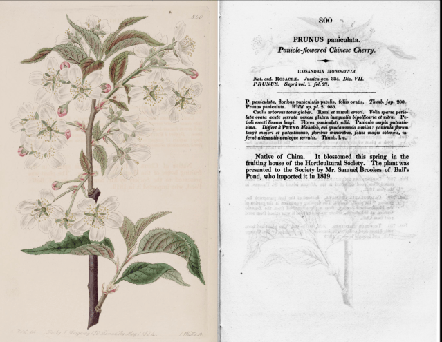 We are told in a footnote that “This Cherry was introduced from China by Mr. Samuel Brookes, of Ball’s Pond, in 1819, and he presented a specimen of it in 1822, to the Horticultural Society. It has since, in two instances, been imported from China by the Society, through the assistance of Mr. Reeves…and is known in China by the name of Yung Fo but is only cultivated as an ornamental plant at Canton, where it rarely produces fruit.” Brookes was not only a Fellow of the Linnaean Society but clearly an enterprising nurseryman because he had a collector named Jospeh Poole working for him, probably in Canton who sent back a wide range of plants including the cherry.