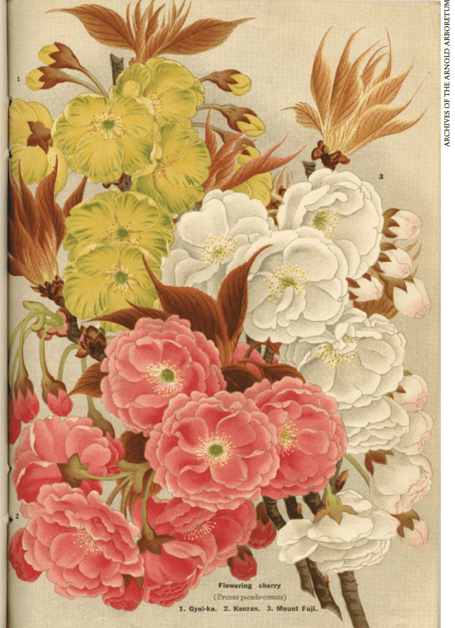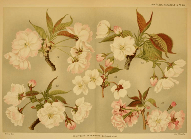 To make matters worse there had been two attempts to describe and identify the various species and varieties, published only a few weeks apart in 1916. Of course they were not identical! First Manaubu Myoshi published a well-illustrated article in The Journal of the College of Science, Imperial University of Tokyo covering 133 different sorts, and a few weeks Ernest Henry Wilson published The Cherries of Japan for the Arnold Arboretum. On top of that English nurseries often changed the names to make them more appealing so everything became a classification nightmare.