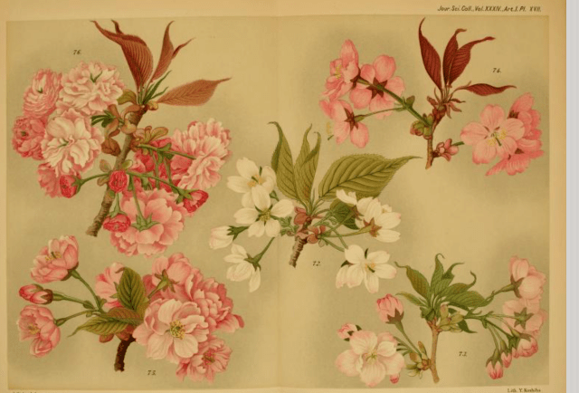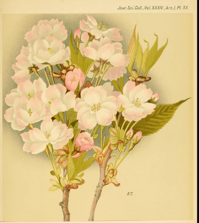 Of course it’s not that ornamental cherries were not known about before then. They had been mentioned by the German naturalist and explorer Englebert Kaempfer in his 1712 book on Japanese plants where he lists six different sorts, with their Japanese names, including ones with double flowers and one that was pink, although without any of the illustrations he added for many other species. But these were merely short Latin descriptions and clearly no seeds or plants reached the west. There were other even shorter mentions by Carl Peter Thunberg in 1784 and Philipp von Siebold in 1830.