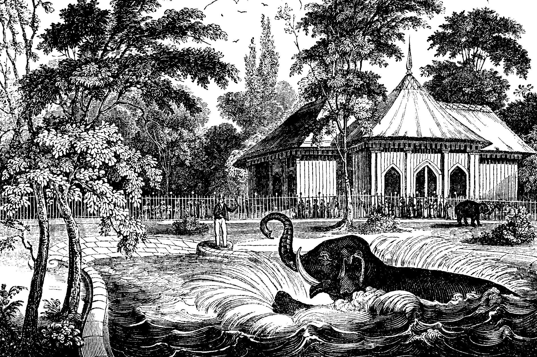 Elephants were clearly seen as a desirable and necessary requirement for a menagerie and two were quickly acquired by the Zoological Society for Regent’s Park. They lived in what was claimed to be “luxurious accommodation” of “capacious dimensions”, but “built in a style of inappropriate rusticity”. They also had “a little park or paddock. The fence is of iron, and light but substantial. Within the area are a few lime-trees, the lower branches of which are thinned by the Elephant repeatedly twisting off their foliage with his trunk, as adroitly as a gardener would gather fruit.” But it was a large pool where “In hot weather he enjoys his ablutions …with great gusto, exhibiting the liveliest tokens of satisfaction and delight. Our artist has endeavoured to represent the noble creature in his bath, though the pencil can afford but an imperfect idea of the extasy of the animal on this occasion.” (The Mirror of Literature, 4 August 1832].
